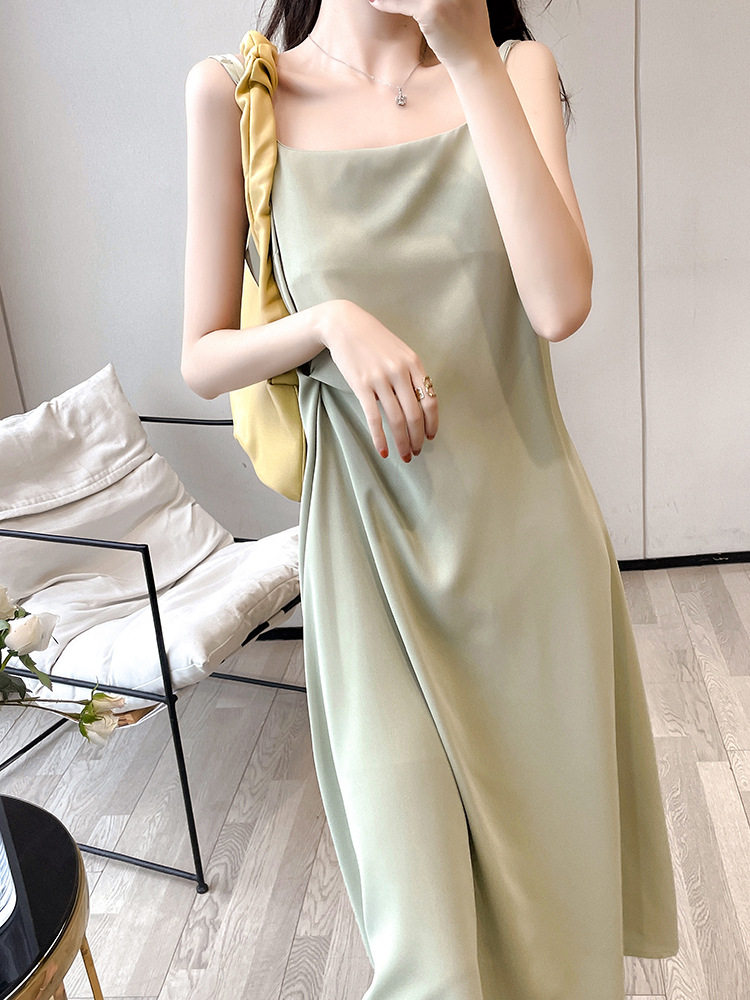连衣裙2021夏减龄小众款简约气质不易皱设计款纯色缎面吊带时装热门设计联盟服务商
